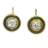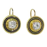 A pair of early Victorian circa 1830 earrings, manifesting the era's penchant for ornamental grandeur. Fashioned from 18K yellow gold, these earrings exhibit the finesse of enamelling, a revered technique since antiquity. Each earring is adorned with two old brilliant-cut diamonds, collectively weighing approximately 1.66ct. The condition is noted as good, with minor enamel wear, encapsulating the historical narrative and aesthetic movements of the time, from the Arts and Crafts to the Art Nouveau.