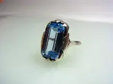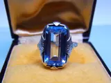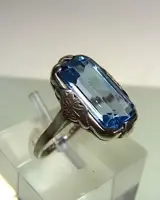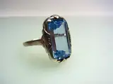 De ringkop is gezet met een achthoekige, gefacetteerde, lichtblauwe, synthetische spinel in een ornamenteel gedecoreerde zetting.