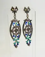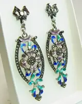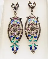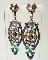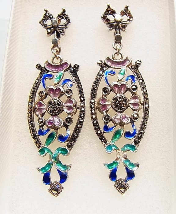 De oorbellen zijn ontworpen als oorstekers in de vorm van een lus, waaraan lange ovale hangers zijn bevestigd in het fijnste opengewerkte en polychrome emaille. De suspensies dragen bloemen en bladeren in het midden, dat wordt omlijst door marcasieten.