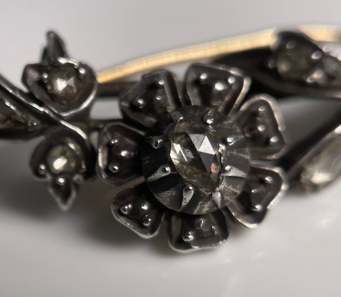 Een antieke gouden en zilveren bloemenbroche bezet met roosgeslepen diamanten. aan een werkende veiligheidsspeld.