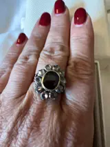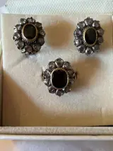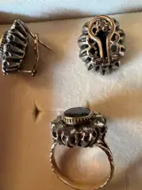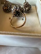 Mooie klassieke set oorbellen en ring in goud en zilver met een lage titel, met saffier en diamanten roosjes.