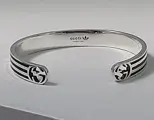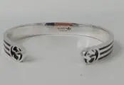 Deze manchetarmband maakt deel uit van de adidas x Gucci-collectie en heeft de Trefoil en 3-strepen. adidas en Gucci wagen zich aan een collectie, waar het web naast de drie witte strepen staat en het GG-monogram combineert met het klaverblad.