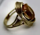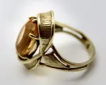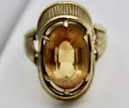 Geelgouden ring met breed en elegant frame goud is deels gesatineerd gemaakt van 14kt/585 gemerkt massief goud, gezet met een grote ovale gefacetteerde geelgouden kleur natuurlijke Citrien ca. 8.7 Ct in 6 klauwen zetting. Ringrail is geornamenteerd, goud is deels gesatineerd, mooi.