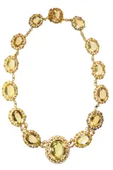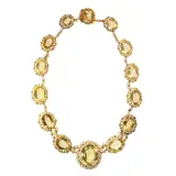 A radiant necklace from the Southern Netherlands, circa 1820, crafted in 18K yellow gold with fine filigree and granulation work. The design showcases fourteen oval citrines, their honeyed glow framed by delicate scrolls of gold wire. Both Georgian and early Victorian in spirit, this jewel reflects the transition of taste between eras, blending opulence with refined lace-like artistry. The cornucopia hallmark affirms its regional origin, while its generous proportions and luminous stones evoke the elegance of early 19th-century fashion. A jewel of distinction, still in very good condition, offering a timeless glimpse of its age.