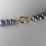 • Parels diameter 0,5 mm, totaal 119,5 karaat, grijs gekleurd