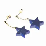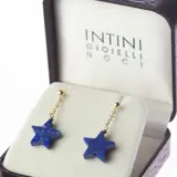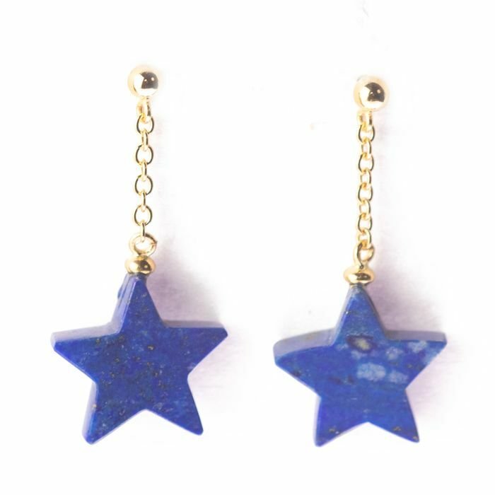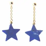 Dangle natuurlijke vallende ster prachtige oorbellen. Een delicate lapis lazuli-ster vastgehouden door een 18-karaats geelgouden ketting. De magische blauwe steen heeft kleine witte kleuren die het startstof van dit delicate element vertegenwoordigen. Eigentijds en uniek stuk ontworpen met een moderne en jeugdige stijl.