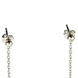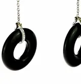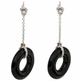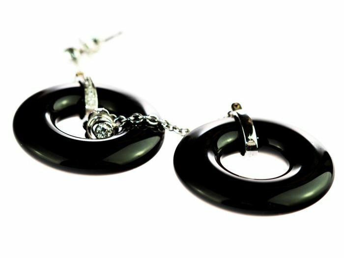 Uniek en modern stuk ontworpen met een stijlvolle en elegante stijl. Diamanten oorbellen met een delicate 18k witgouden ketting die eindigt in een zwarte donut agaat edelsteen omringd door meer diamanten.