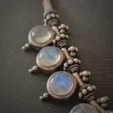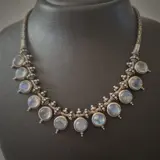 Een zwaar uitgevoerde zilveren choker met daarin regenboog maansteen,ook wel witte labradoriet genoemd.