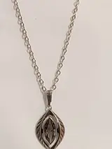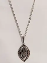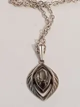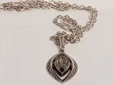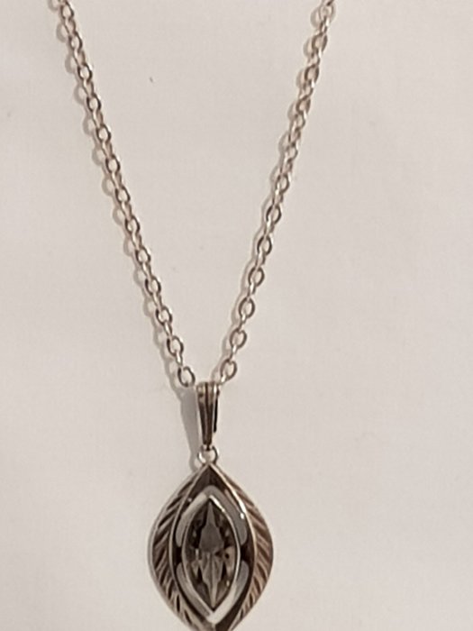 Apart gevormd schakel collier breedte 0.3 cm , ca 60 cm lang waaraan een ovaal vormige hanger met een geslepen en gefacetteerde spinel steen. Geheel is in goede tot uitstekende staat. Het geheel is in de jaren 60 van de vorige eeuw vervaardigd