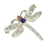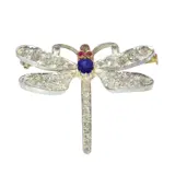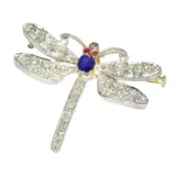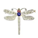 Circa 1900, a Victorian dragonfly brooch in 18 carat red gold with silver topped wings, lavishly set with a scatter of old cut and rose cut diamonds. A vivid sapphire forms the body, with two small rubies picked out as eyes, and fine openwork gives the wings a light, floating look despite the sparkle. It sits neatly on the collar or lapel, catching light with every turn, a tiny creature of evening air made in precious materials.