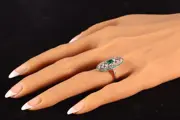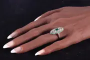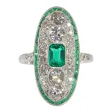 An exquisite Art Deco platinum engagement ring, circa 1920, adorned with a captivating central Colombian old mine emerald, exuding a vivid, warm, sparkling, transparent green hue. This ring features 24 dazzling diamonds, including four old mine brilliant cut diamonds and 20 old mine brilliant cut diamonds, totaling approximately 2.00 carats. It's a testament to the timeless elegance of the Art Deco era, characterized by abstract motifs and geometrical forms.