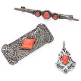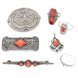 Twee broches en de hanger zijn bezet met cabochon geslepen bloedkoralen. Twee ringen zijn bezet met een table cut carneool. De ovalebroche is rijkelijk bezet met marcasiet.