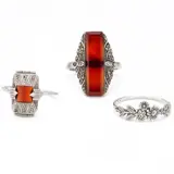 Lot bestaande uit 3 broches, 3 ringen en 1 hanger in art deco stijl.