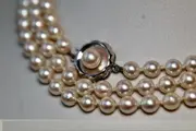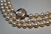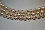 Extra lange of 2 rij parels Goldsmith's Germany Halsketting met echte Japanse zee/zoutwater Akoya parels met een extra glanzende glans en ronde tot bijna ronde vorm en zilveren slot betoverd met zeer glanzende parel. Prachtige staat, in juwelendoosje.