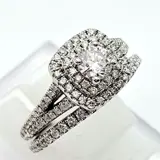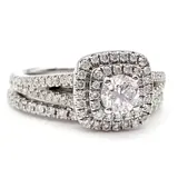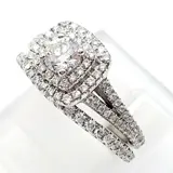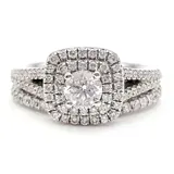 De halo met dubbele diamant omringt 1 briljant geslepen hoofddiamant van 0,33 ct bezet met 4 tanden.
