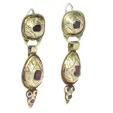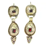 These Iberian Baroque earrings, crafted circa 1750 in rich yellow gold, display the exuberant spirit of their age. Their sculpted surfaces, with repoussé floral motifs at the reverse, frame glowing red garnets that catch the light with warmth and depth. The tiered composition, from square to pear-shaped elements, creates a sense of lively movement, typical of Spanish and Portuguese jewels of the eighteenth century. Each earring carries an echo of history: a graceful ornament once meant to sway with candlelight, now preserved as a testament to Baroque artistry and enduring elegance.