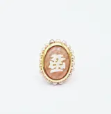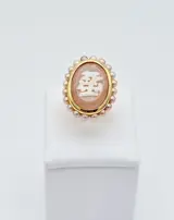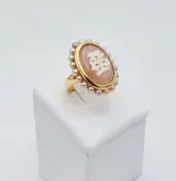 Damesring van 18 kt geelgoud met een centrale roze kwarts cabochon ct 11.60, met een gravure van parelmoer erop gelegd en gelijmd en met ongeveer 20 Akoya parels met een diameter van 3,5 mm.