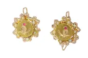 Edelsteen(en): Twee rode strass (ook wel pasta genoemd) als robijnimitatie en 14 door de mens gemaakte halve zaadsteenparels