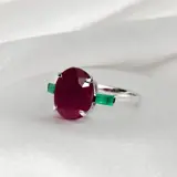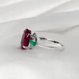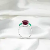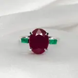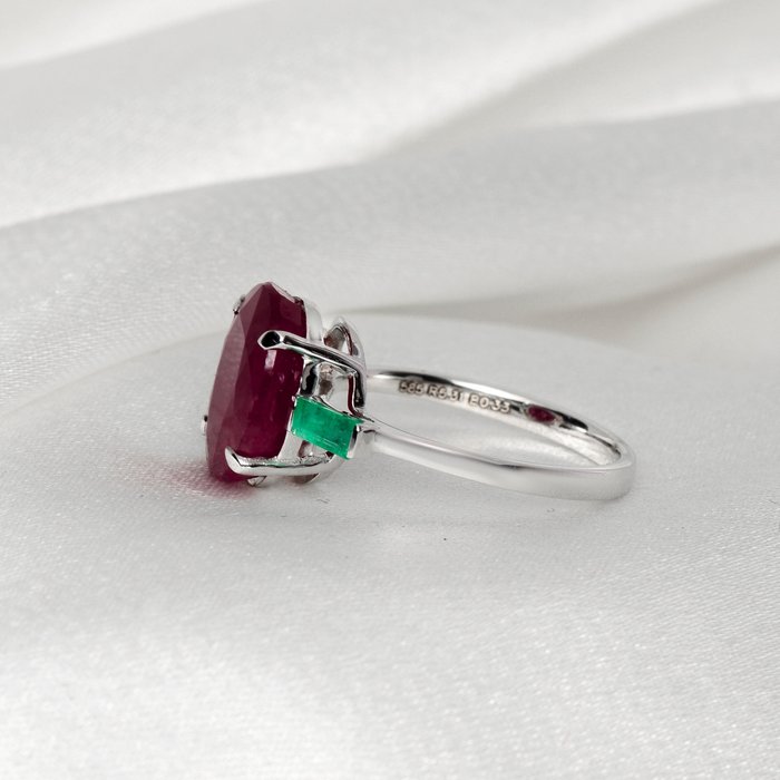 De IGI-gecertificeerde natuurlijke niet-verwarmde robijn met een gewicht van 5,31 ct bezet met 2 stuks natuurlijke groene smaragden op de 14K witgouden band, het ontwerp met 3 stenen maakt de ring zeer eenvoudig maar uitstekend en kan gemakkelijk elke dag worden gedragen