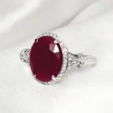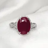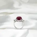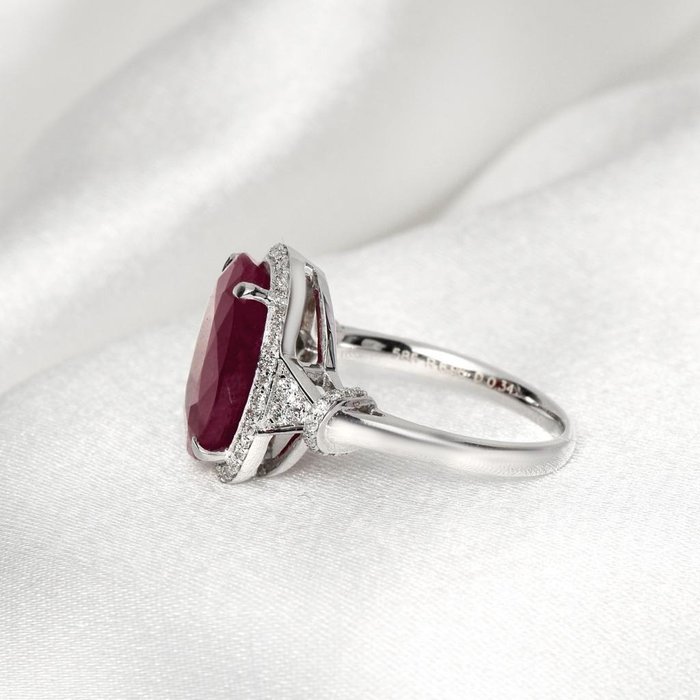 Een IGI-gecertificeerde natuurlijke onverwarmde robijn van 6,96 ct bezet met natuurlijke FG VS-diamanten van 0,34 ct op de 14K witgouden band.
