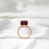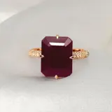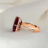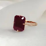 IGI-gecertificeerde natuurlijke, niet-verwarmde robijn met een gewicht van 8,76 ct gezet op 14K roze gouden 3 rijen pavéband gebruikt FG VS natuurlijke ronde briljant geslepen diamanten met een gewicht van 0,36 ct.