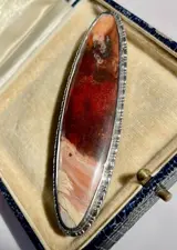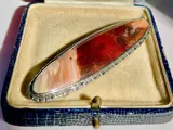 Schitterende antieke Schotse broche met donkerrood en creme patroon Agaatsteen die het licht prachtig vangt, in uitstekende staat.