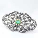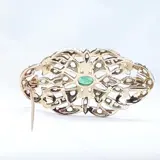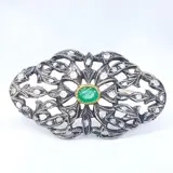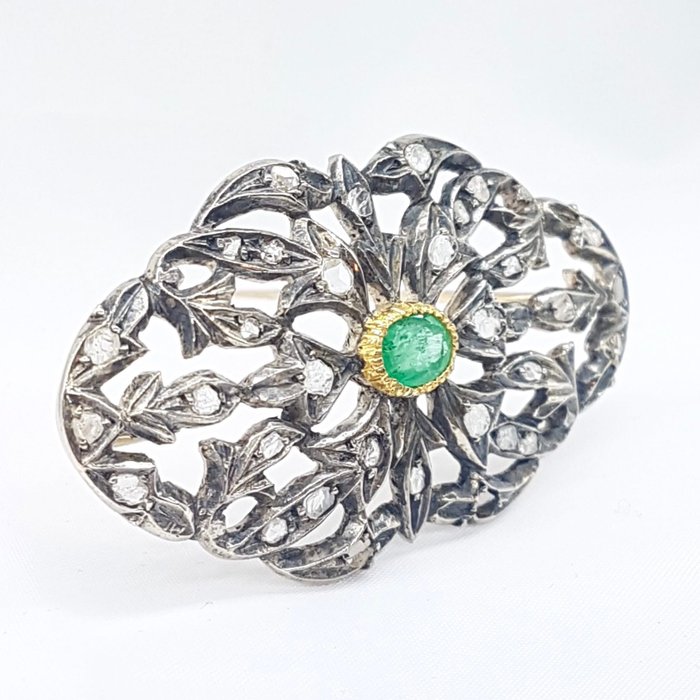 gemaakt van 925 zilver, 12 kt goud in de sluiting en 24 kt puur goud rond de smaragd.