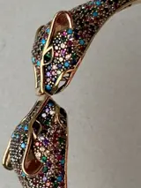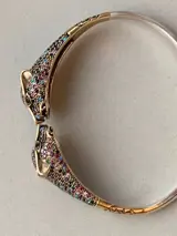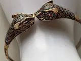 Bijzonder mooie zilveren vergulde armband met Panterkoppen. Uitgevoerd met Robijn/ Smaragd Saffieren Turkoois. De Panters hebben groene glasoogjes Alle stenen aanwezig.