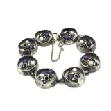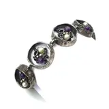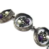 Schitterende, rijkelijk doorboorde armband uit de periode Modernisme / Brutalisme. Ringvormige schakels gegoten in massief zilver met een ruw oppervlak, aan de binnenkant versierd met ringen, bollen, parels en amethisten. Kliksluiting met veiligheidsketting. Gemerkt, gemaakt door de beroemde Duitse sieradenfabrikant Perli in Schwäbisch Gmünd, jaren 60.
