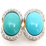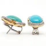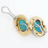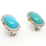 Gouden oorbellen met ovale cabochon geslepen turkoois gekalibreerd op 17x13 mm, geflankeerd door achtenzestig briljanten met een totaal geschat gewicht van 0,60 ct. Witgouden omega sluitsystemen.