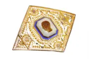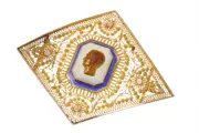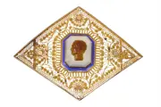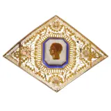 An unusually large French brooch dating to circa 1830, showcasing a finely carved male portrait in brown chalcedony, mounted atop a subtly faceted pale agate or quartz base. The jewel’s generous proportions, combined with intricate canetille goldwork and vibrant blue enamel, create a striking neoclassical presence. Likely once the centrepiece of a grander jewel, it was later adapted into a brooch with remarkable finesse. A rare survivor of refined early 19th-century taste — imposing yet intimate, and quietly evocative.