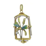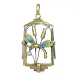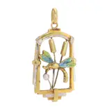 A stylish pendant from about 1920, this delicate jewel blends the lingering poetry of Art Nouveau with the cleaner geometry that would soon define Art Deco. In yellow and white gold, it is designed as a dragonfly resting among reedmace, its wings picked out in softly shaded enamel and its body enlivened by a single seed pearl. Small in scale yet finely observed, it carries something of the stillness and light of waterside nature.