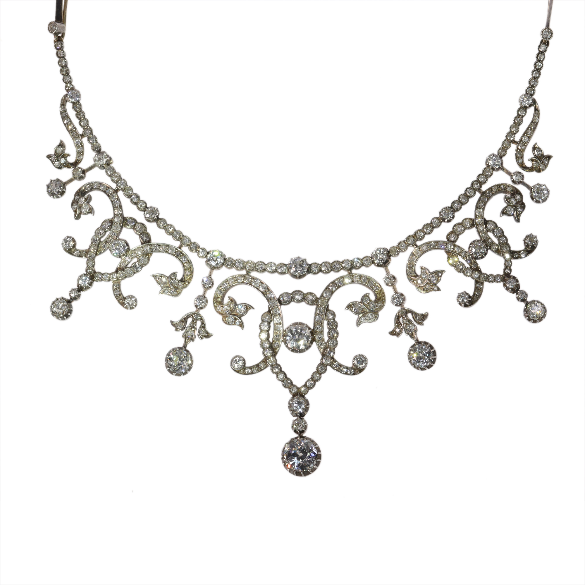 An exceptional Romantic Victorian choker, ca. 1860, featuring over 13 carats of natural diamonds in a lyrical composition of open scrolls and articulated drops. What sets this jewel apart is its remarkable use of old brilliant cuts throughout—eschewing the more common rose cuts, even for the tiniest stones. Once convertible into a tiara, the necklace’s regal poise and delicate detailing evoke candlelit evenings and whispered conversation. Impressive yet finely wrought, this piece bridges stately grandeur with sentimental elegance, offering a rare chance to wear history at the neckline.