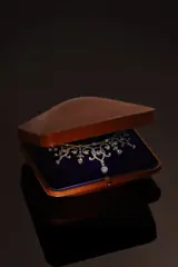 An exceptional Romantic Victorian choker, ca. 1860, featuring over 13 carats of natural diamonds in a lyrical composition of open scrolls and articulated drops. What sets this jewel apart is its remarkable use of old brilliant cuts throughout—eschewing the more common rose cuts, even for the tiniest stones. Once convertible into a tiara, the necklace’s regal poise and delicate detailing evoke candlelit evenings and whispered conversation. Impressive yet finely wrought, this piece bridges stately grandeur with sentimental elegance, offering a rare chance to wear history at the neckline.