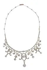 An exceptional Romantic Victorian choker, ca. 1860, featuring over 13 carats of natural diamonds in a lyrical composition of open scrolls and articulated drops. What sets this jewel apart is its remarkable use of old brilliant cuts throughout—eschewing the more common rose cuts, even for the tiniest stones. Once convertible into a tiara, the necklace’s regal poise and delicate detailing evoke candlelit evenings and whispered conversation. Impressive yet finely wrought, this piece bridges stately grandeur with sentimental elegance, offering a rare chance to wear history at the neckline.