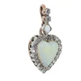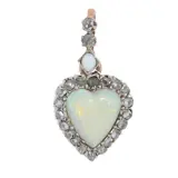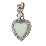 A tender Victorian locket pendant from around 1880, centred on a heart shaped opal with a soft, shifting play of colour, and framed by glittering old diamonds. The design is small and intimate, with the kind of quiet sentiment that Victorian jewellery carries so well. At the back, a glass covered compartment allows a photograph or other small keepsake to be kept within, which adds to its personal and affectionate character.