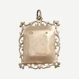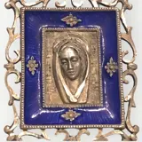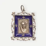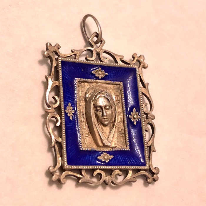 Religieuze hanger in 925 zilver gesigneerd Ottaviani. Gezicht van de Heilige Maagd Maria in reliëf omgeven door een blauw geëmailleerde lijst en afgewerkt met opengewerkte kant.