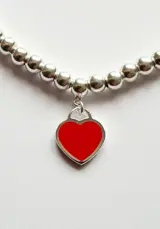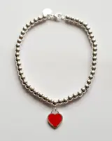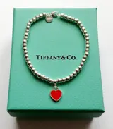 Tiffany & Co massief 925 zilveren kralen damesarmband, mini hart metalen hanger in het midden, rood aan de voorkant en gemarkeerd op de achterkant "Please return to Tiffany"