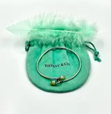 De armband is verpakt in het iconische suède tasje van Tiffany & Co. in turquoise natuurlijk.