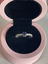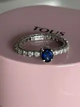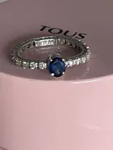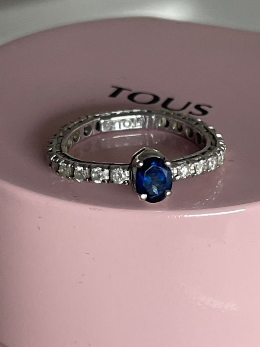 Kostbare ring van het merk Tous, gemaakt van 18 kt witgoud, versierd met blauwe saffier in het centrale deel in een ovale vorm van 0,5 mm gevangen in 4 klauwen. De hele hoepel van de ring is gearticuleerd en is versierd met briljant geslepen diamanten van in totaal 0,48 ct.