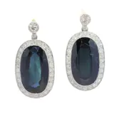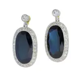 Circa 1920, a pair of transitional late Belle Époque to early Art Deco drop earrings in platinum and 18ct yellow gold, each centred with an oval sapphire, together weighing approximately 12.40 carats, within a fine border of 58 diamonds and suspended from a diamond set terminal. The openwork backs and delicate millegraining keep the look light on the ear, yet the crisp oval frames hint at the decade to come.