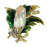 A marvel of Victorian artistry, this grand brooch captivates with its blend of natural inspiration and exquisite craftsmanship. At its heart lies an extraordinary blister pearl, almost 40mm in length, with intricate lines and grooves that evoke the petals of a flower in bloom. This rare pearl is set amid vibrant green enamel leaves, their texture reminiscent of delicate veining, adding lifelike depth to the design. Surrounding the pearl, 49 old brilliant-cut diamonds, totalling approximately 4.80 carats, glisten with subtle fire, enhancing the piece’s aura of mystery. Each element reflects the Romantic Victorian Period's reverence for nature and sentimentality, while the baroque pearl nestled alongside furthers its organic elegance. Likely crafted during the Second Empire period, circa 1840, this brooch is a unique treasure from a bygone age, exuding an air of exclusivity that few pieces can rival.