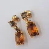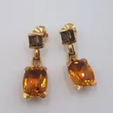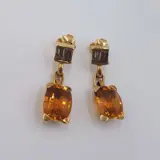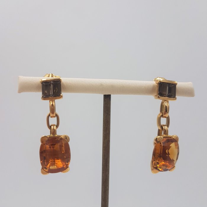 18 kt geelgouden oorbellen, exclusief ontwerp van Vasari Jewellery, met 2 kussengeslepen citrienen, met een totaalgewicht van ongeveer 13,6 ct en 4 gerookte stokbroodgeslepen kwarts, met een gewicht van ongeveer 1,72 ct. Duw de sluiting terug.