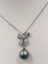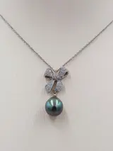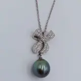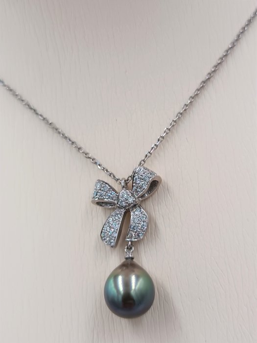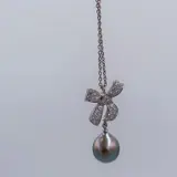 18K witgouden hanger met 37cm lange ketting met 9.9mm Tahitiaanse parel en lus bezet met 0.37ct pavé diamanten geschat G/H kleur en helderheid geschat VS