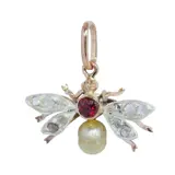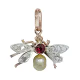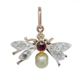 Victorian pendant, made around 1900, designed as a stylised fly or bee. Set with rose cut diamonds and senailles, a red paste centre, and a cultured pearl drop. A small ornamental jewel with the naturalistic charm so loved in the period.