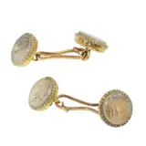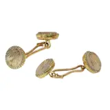 Faint but recognisable remnants of the French control mark for 18K gold, representing an eagle's head (in use in France from about 1838), can be seen in the eyes on the reverse of the buttons. A partial maker’s mark (the identifying mark registered to an individual maker or workshop) is also visible there. The word DEPOSE is stamped on the connecting piece between the buttons.