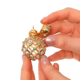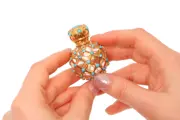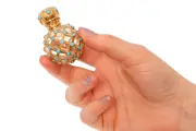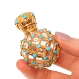 Victorian, circa 1860, a French 18K gold perfume bottle cased in an openwork gold lattice, each junction set with a cabochon turquoise. A hinged turban cap lends an Ottoman inspired accent, in step with the Orientalist taste fashionable in Paris, in painting, dress, and the decorative arts, including the harem scenes of Ingres and Delacroix. Turquoise was named for its Turkish route into Europe, a link that suits the turban form rather well. The perfume aperture retains its removable gold applicator stopper for discreet dabbing behind the ears, an oddly intimate object that still suggests scent, skin, and a private ritual.