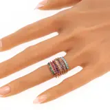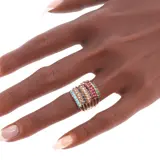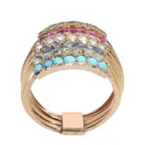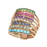 A Victorian harem ring, circa 1890, formed as seven slender bands in warm reddish yellow gold, each set with its own line of gemstones: rose cut diamonds, turquoise, sapphires, seed pearls, amethysts, rubies and emeralds. It has that late Victorian gift for colour and variety, almost as if seven rings had been gathered into one, yet the effect remains composed and lively.