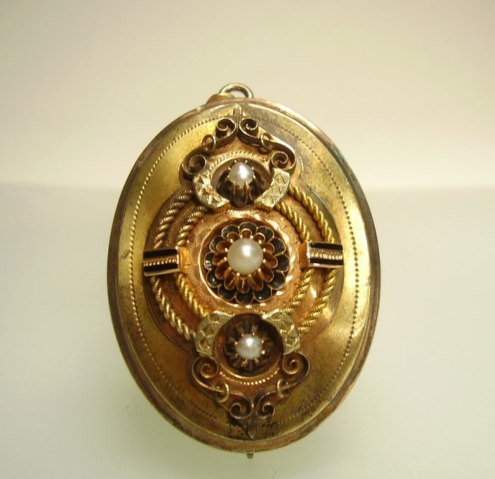 Het front is luxueus gestructureerd en heeft opgezette koorden en individueel gezette grijswitte rivierparels omgeven door ornamenten. Op de achterkant zit een houder voor een oude ovale ruit met een vellingkant, een draagoogje en een naaldfolder. De lijst met de ruit kan door middel van een scharnier worden geopend en laat ruimte voor foto's of haarlokken.