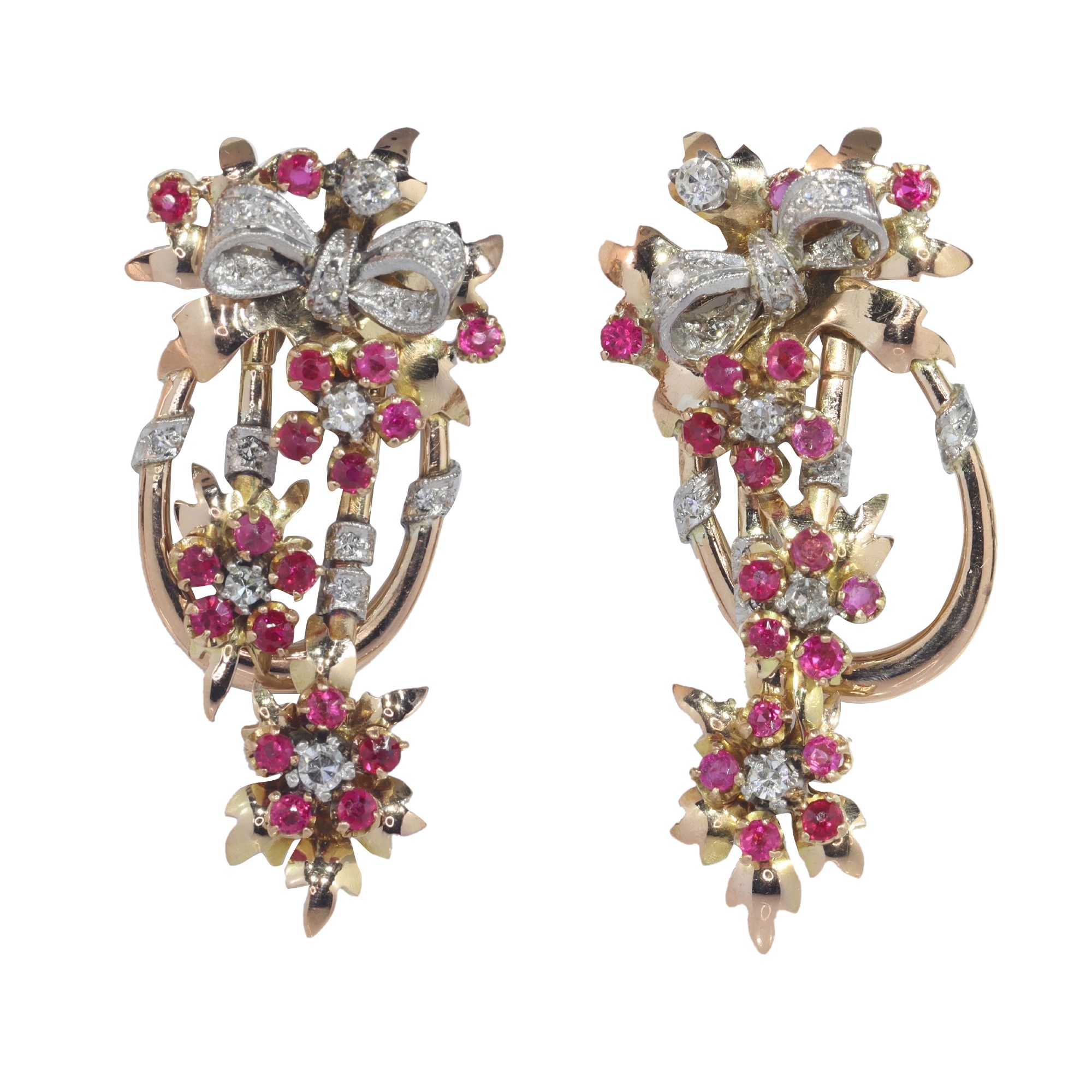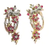 These vintage 1950s Retro pendant earrings are a harmonious blend of style and opulence. Fashioned from two tones of 18K gold, they exemplify the era's penchant for stylized, geometric forms. Adorned with 34 single brilliant cut diamonds and 36 vibrant rubies, these earrings are a testament to the luxurious aesthetics of the post-war period. The fusion of glittering diamonds and rich rubies, set in a design that balances boldness and elegance, makes these earrings more than mere accessories; they are a celebration of the transformative power of jewellery, embodying the spirit of the Retro and Fifties era with every glint and gleam.